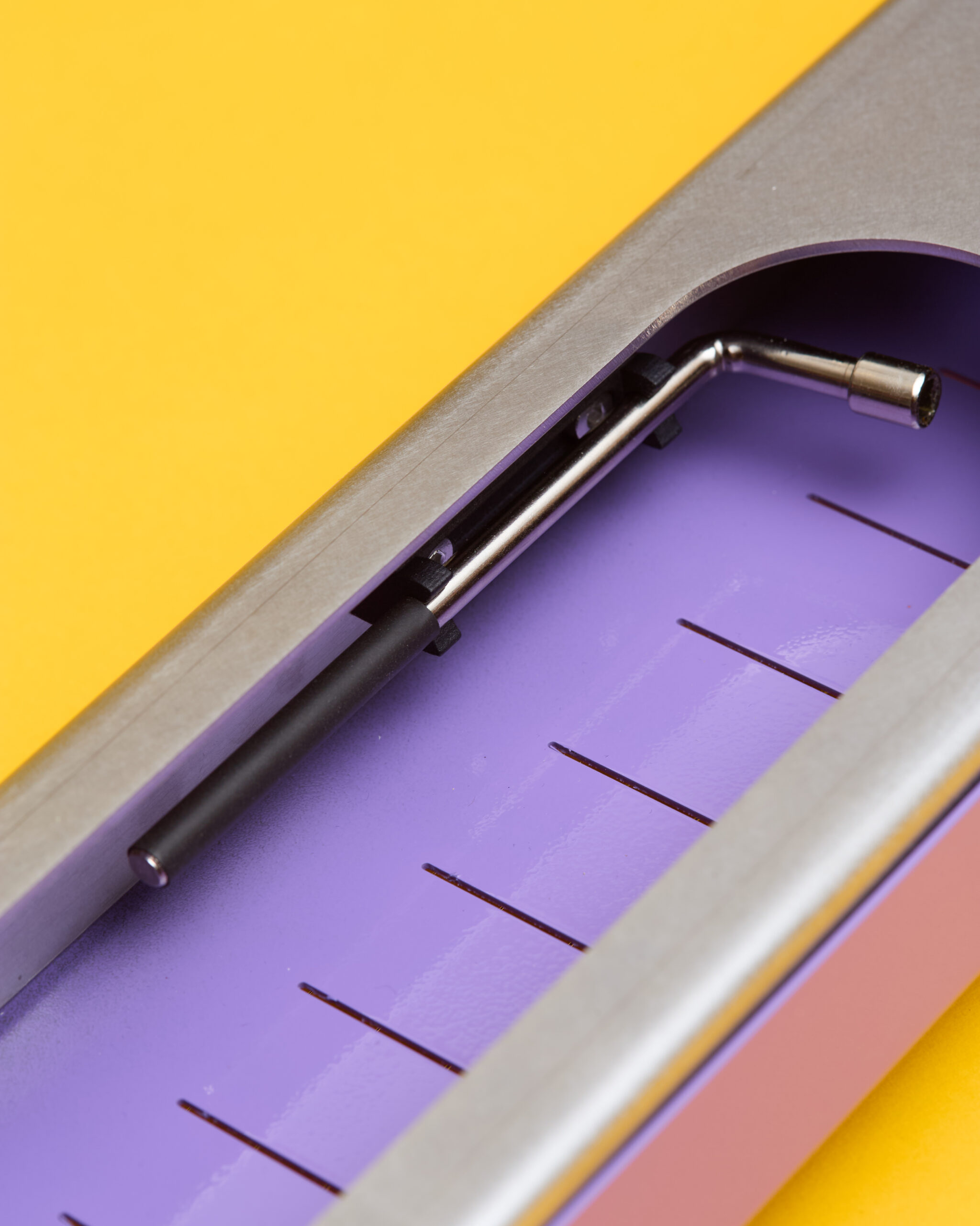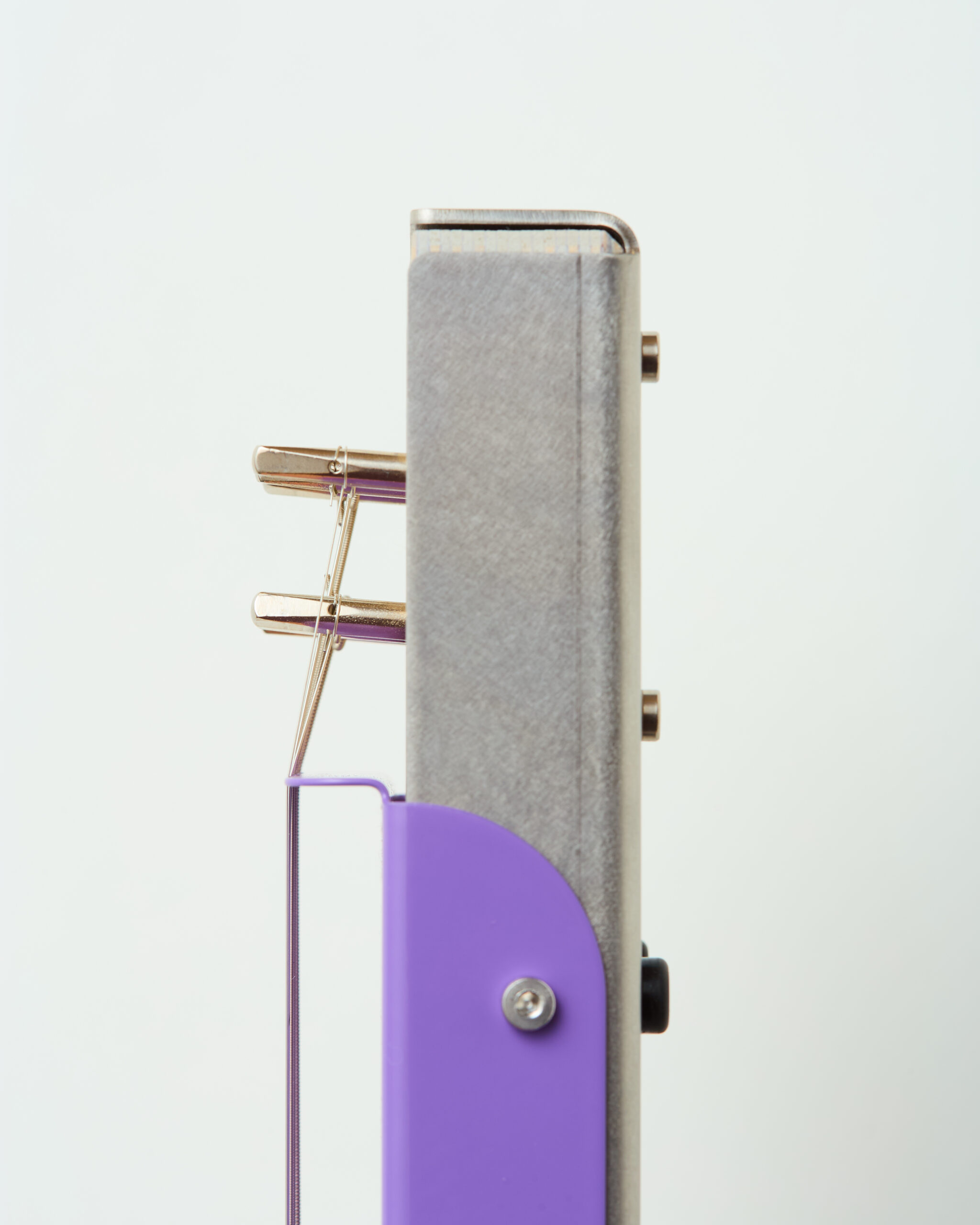 - LOG’s steel top comes in ‘Pop Lilac’ powder coat, paired with a raw industrial-finish stainless steel back. It has a 570mm (22.5″) scale length and has six strings (.058–.013). It works beautifully with E or D tunings and the common A6 tuning. Total weight is 2.3kg (5 lbs). Each LOG ships with a tuning key, an A3 art print with a curated tuning chart on the back, and a foam-padded cardboard box.